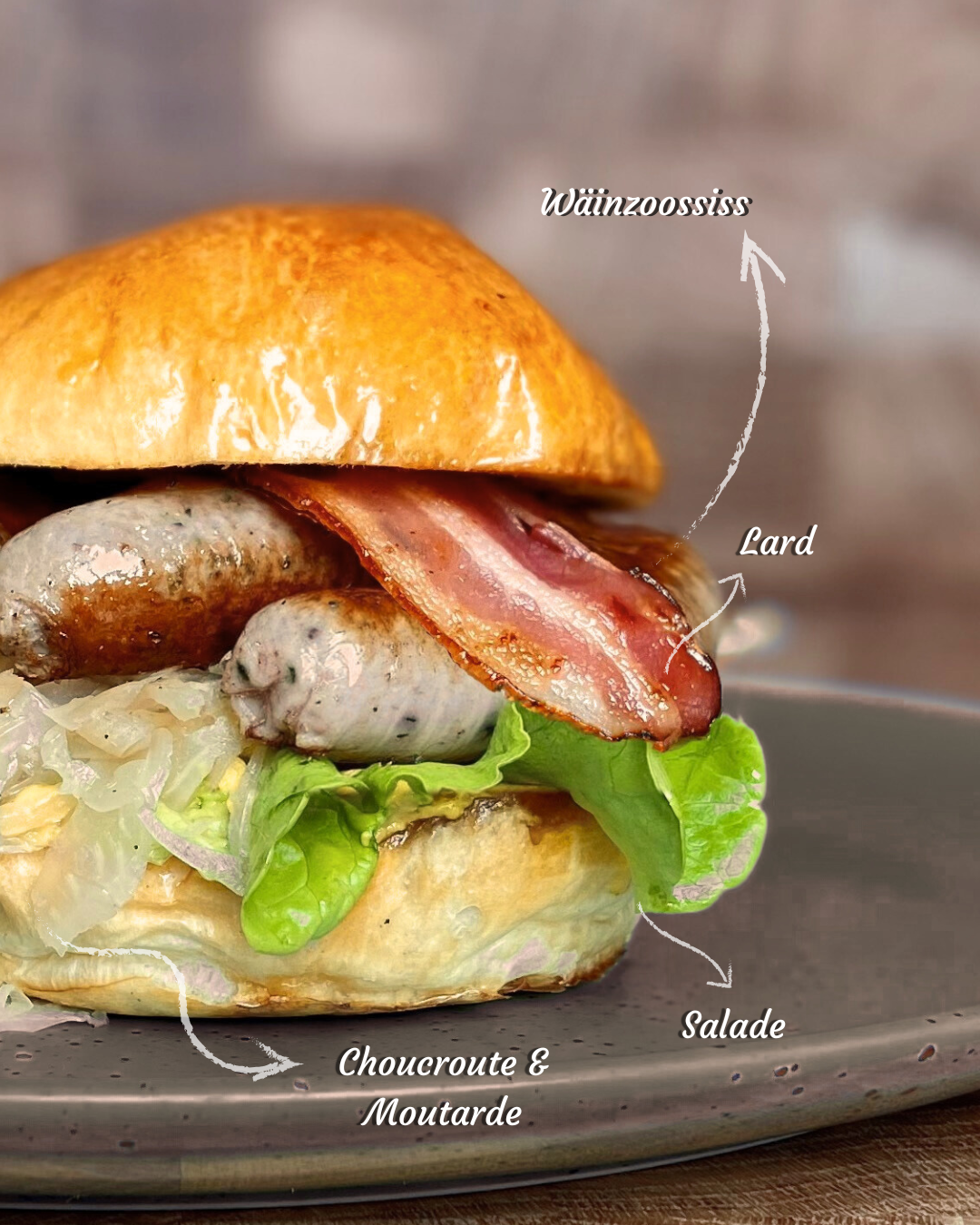 ZAZ Burger maison Mélange boeuf et porc, Kachkéis, oignons frits, lard, frites, mayonnaise maison au baconPlat 16.00 €